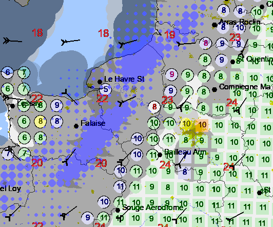 Precipitation is marked by blue dots when more than 0.5 mm/h; dots growing with intensity.