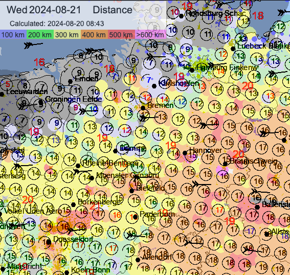 Note: The calculations have about 30 minutes spare time build in and the forecast should be read as "realistic flight distance". This means that the experienced x-country pilot can quite easily plan a task that spans over longer distances than indicated here, based on weather experiences and local experiences.