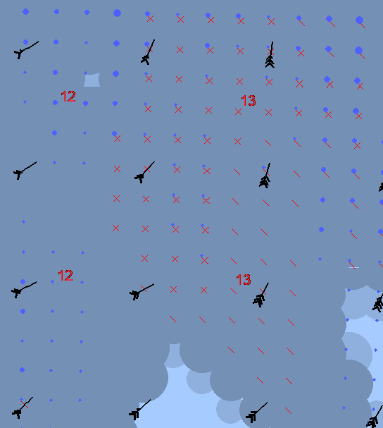 Precipitation is marked by blue dots when more than 0.5 mm/h; dots growing with intensity.