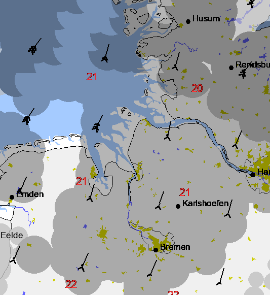 Strength in km/h. - 10 km/h per bar on the arrow (or about 5 knots/). 2 opposite bars (1 angle) = 10 knots.